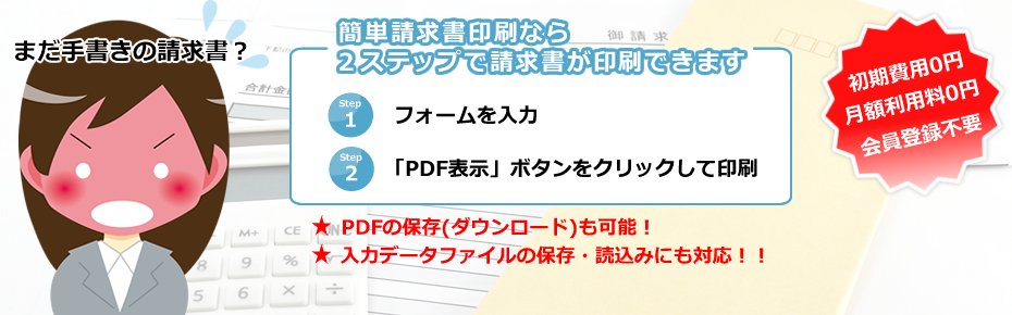 ファイルから内容を読込む 入力内容をファイルに保存する 消費税: 切り捨て 四捨五入 切り上げ 請 求 書 平成 年 月 日 No. 様 下記のとおり御請求申し上げます 入金先 税込合計金額 税率 % 消費税額 摘 要 数 量 単 価 金 額 (税抜) 合 計 備考 請求書PDFを保存する 請求書PDFを表示する